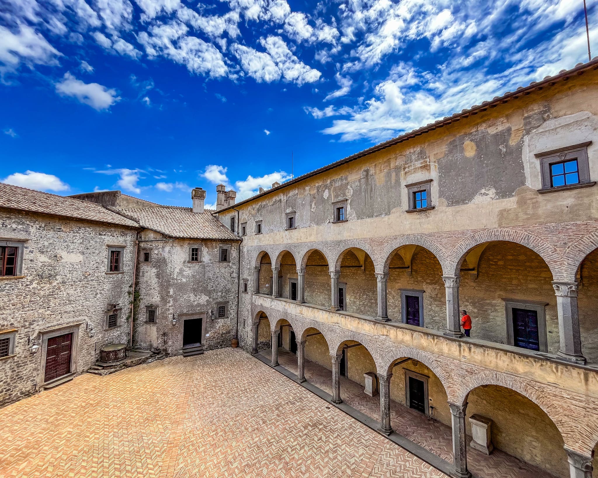 La corte si presenta come una piazza di cittadella, e domina lo spazio con le sue imponenti arcate, poste su due piani. La scalinata porta ai Piani Nobili del Palazzo, dove gli Orsini intrattenevano i visitatori. Qui si è svolto uno dei fatti più significativi dell’intera dinastia. Nella primavera del 1553 infatti, il Cardinale tutore di Paolo Giordano e l’ambasciatore di Cosimo de Medici, concludono la trattativa per un matrimonio, quello tra Paolo Giordano e Isabella de Medici, allora undicenni. Pochi anni più tardi i due ragazzi si unirono ufficialmente in un matrimonio puramente politico, ma sicuramente sfarzoso.