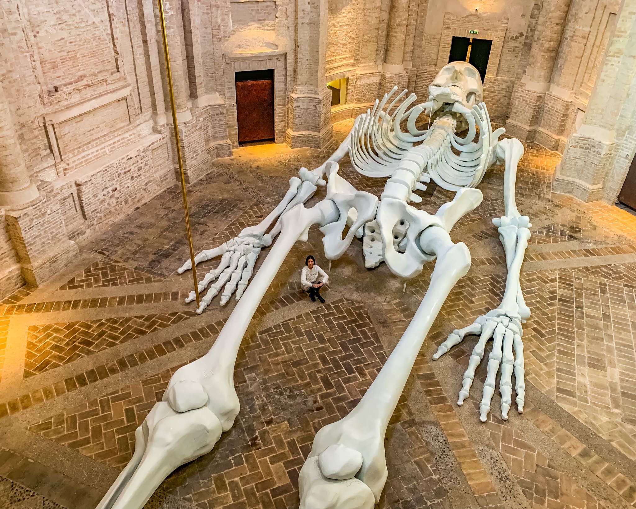 E’ la riproduzione di uno scheletro umano, con un particolare naso a becco. Il suo nome deriva molto probabilmente dall’asta dorata che parte dalla falange della mano, che dovrebbe rappresentare un magnete che collega la scultura al Cosmo. E’ il luogo perfetto da visitare con i bambini, attratti dalla mole della struttura e dalla storia che le ronza attorno. Se ti trovi in vacanza a Foligno devi necessariamente farci un salto.. ah! Puoi girare tra le sue ossa, ma miraccomando a non saltarci intorno!