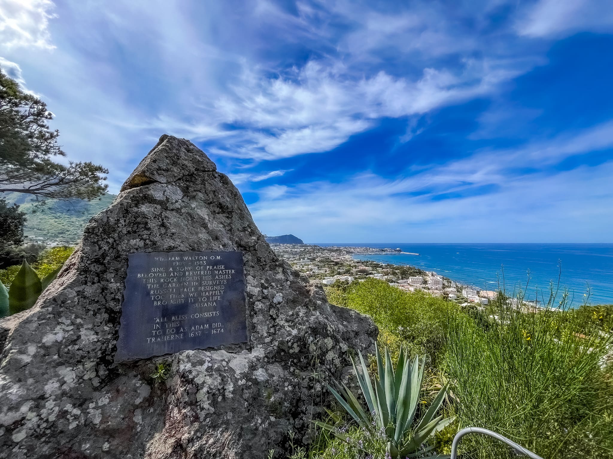 Sulla cima più alta di La Mortella, là dove il cielo si tocca con un dito e il vento sussurra tra i rami, si trova un luogo che vibra di silenzio e sacralità: la Roccia di Sir William Walton.